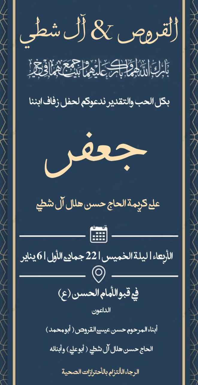 تحتفل عائلة القروص والشطي في تاروت مساء يوم الأربعاء بزفاف الشاب جعفر حسن عيسى القروص على كريمة الحاج حسن هلال آل شطي في قبو الإمام الحسن بحي الفسيل بتاروت وسط فرحة الأهل والأصدقاء ومحبي العريسين.