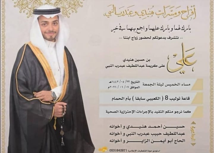 تحتفل عائلة هنيدي وعبد النبي في أم الحمام مساء يوم الخميس بزفاف الشاب علي حسين أحمد هنيدي على كريمة الحاج عبد اللطيف حبيب عبد النبي في قاعة توليب 8- الكعيبي سابقا - بأم الحمام وسط فرحة الأهل والأصدقاء ومحبي العريسين.