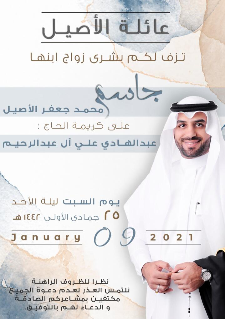 تحتفل عائلة الأصيل وآل عبد الرحيم في سيهات مساء يوم السبت بزفاف الشاب جاسم محمد جعفر الأصيل على كريمة الحاج عبد الهادي علي آل عبد الرحيم بحضور جمع من الأهل والأصدقاء والمحبين.