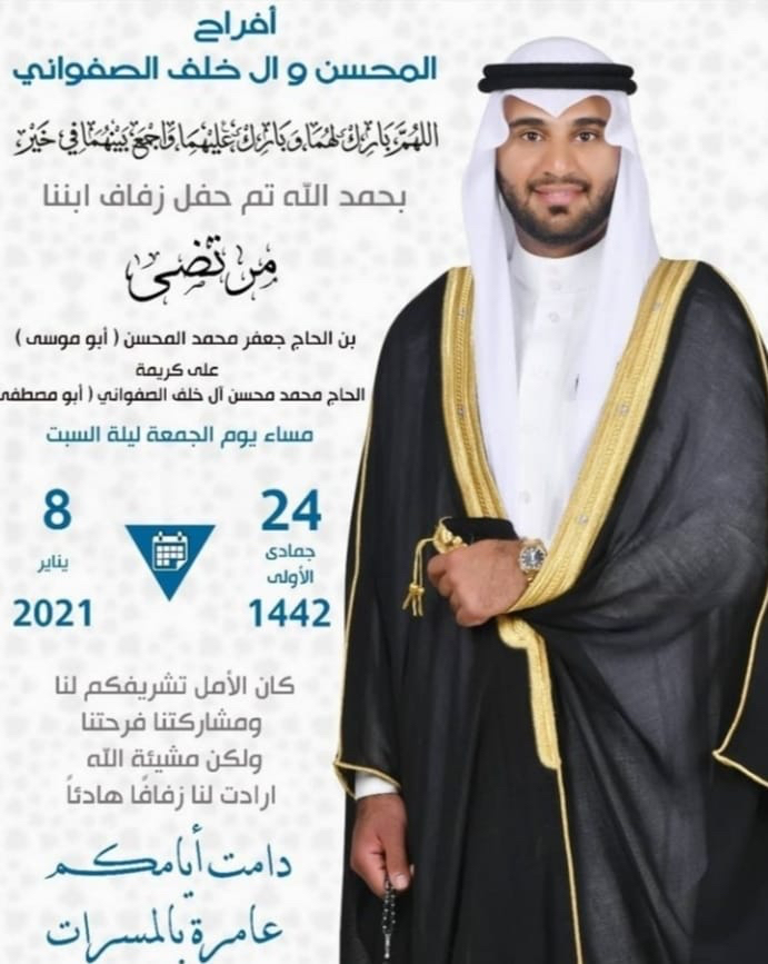احتفلت عائلة المحسن وآل خلف الصفواني في العوامية مساء يوم الجمعة بزفاف الشاب مرتضى جعفر محمد المحسن على كريمة الحاج محمد محسن آل خلف الصفواني وسط فرحة الأهل والأصدقاء ومحبي العريسين.