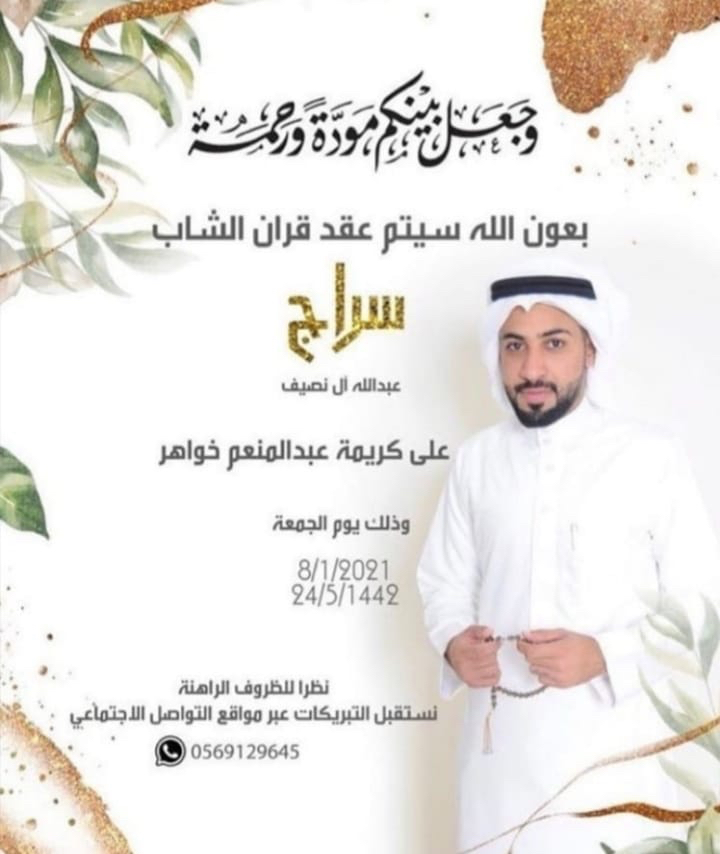 احتفلت عائلة آل نصيف والخواهر في سيهات مساء يوم الجمعة بعقد قران الشاب سراج عبدالله ال نصيف على كريمة الحاج عبد المنعم الخواهر وسط فرحة الأهل والأصدقاء ومحبي العريسين.