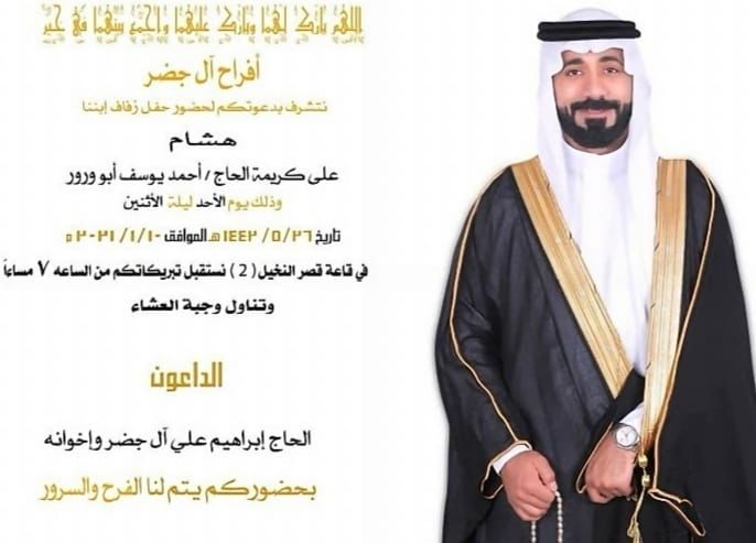 تحتفل عائلة آل جضر وأبو ورور في سيهات مساء يوم الأحد بزفاف الشاب هشام ابراهيم علي آل جضر على كريمة الحاج أحمد يوسف أبو ورور في قاعة «النخيل 2» وسط فرحة الأهل والأصدقاء ومحبي العريسين.