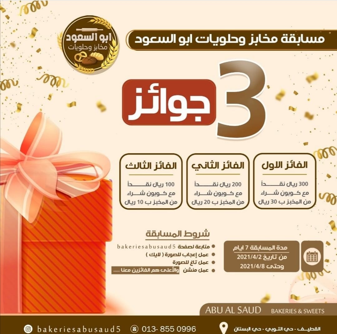 - الفائز الأول 300 ريال نقداً مع كوبون شراء من المخبز بـ 30 ريال