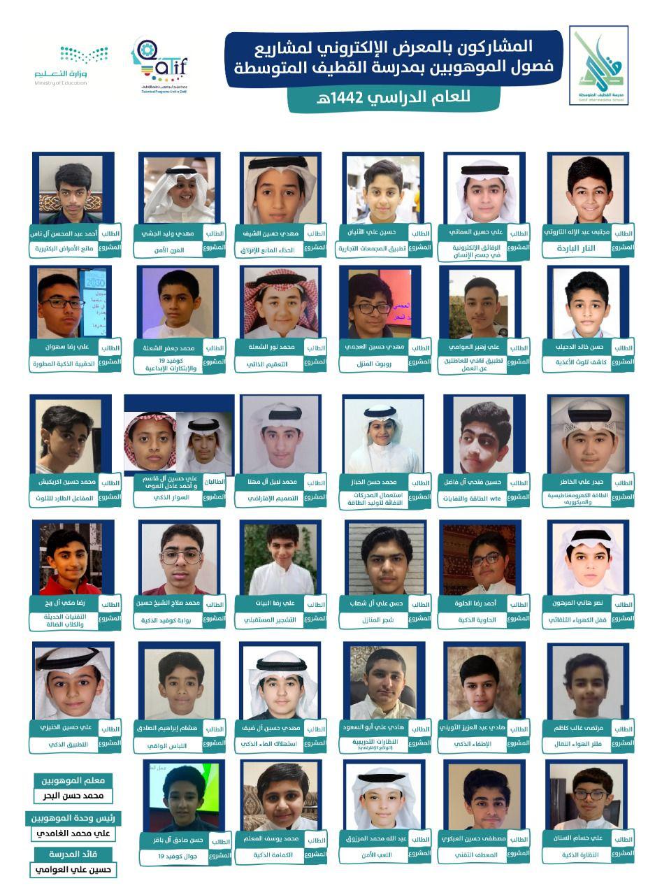 نظمت مدرسة القطيف المتوسطة، معرضًا إلكترونيًا لمشاريع الطلاب بفصول الموهوبين، بعدد 35 مشروعًا ابتكاريًا، وبحوث علمية للبرنامج الإثرائي الافتراضي عن بعد للفصل الدراسي الثاني 1442 للوحدات الإثرائية ”الأمن والسلامة، تحديات كورونا، مهن المستقبل“.