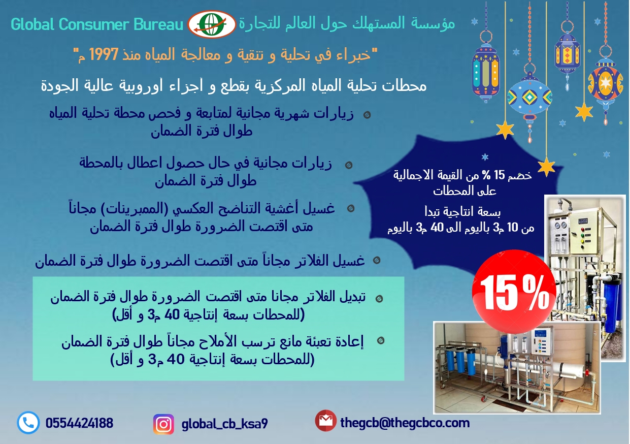 ”خصم 15% على محطات تحلية المياه المركزية بسعة انتاجية من 10,000 لتر إلى 40,000 لتر + فلاتر ومانع ترسب أملاح مجاناً طوال فترة الضمان + زيارات شهرية وخدمات ما بعد البيع مجاناً طوال فترة الضمان“