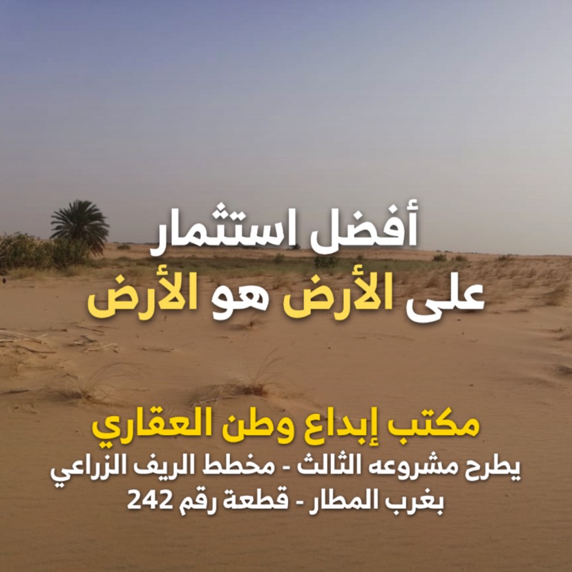 مكتب ابداع وطن العقاري وبمشروعه الثالث - مخطط الريف الزراعي بغرب المطار - قطعة رقم 242