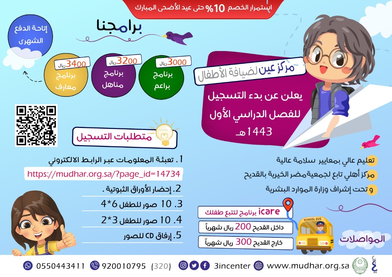 التابع لجمعية مضر الخيرية بالقديح يعلن عن بدء التسجيل للفصل الدراسي الأول 1443هـ، مع اتخاذ كافة الإحترازات الوقائية ضد فيروس كورونا.