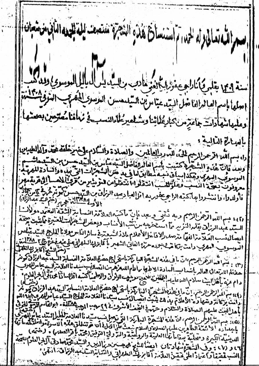 ونص الوثيقة:[9] بسم الله تعالى، وله الحمد، تم استنساخ هذه المشجرة منتصف ليلة الجمعة الثامن من شعبان سنة 1409، بقلمي وأنا راجي عفو ربي الغني هادي بن السيد يس آل باليل الموسوي، وقد كتب أصلها باسم العالم الفاضل السيد عباس بن السيد حسن الموسوي المهري المتوفى سنة 1408، وعليها شهادات جماعة من كبارِ علمائنا ومشاهير علماء النسب في زماننا مُعترفين بصحتها بالعبارات التالية: