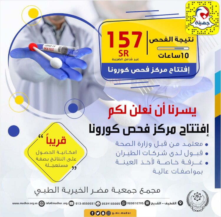 فحص كورونا بـ157 ريال فقط في «مضر الطبي»