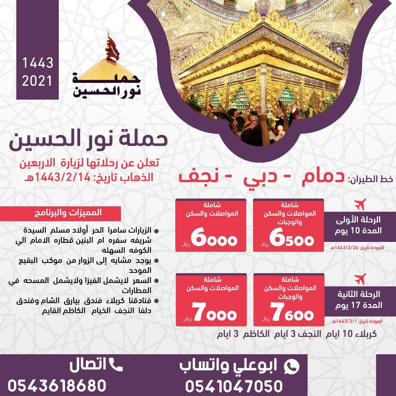 حملة نور الحسين تعلن عن رحلاتها لزيارة الاربعين الذهاب تاريخ: 1443/02/14 ه