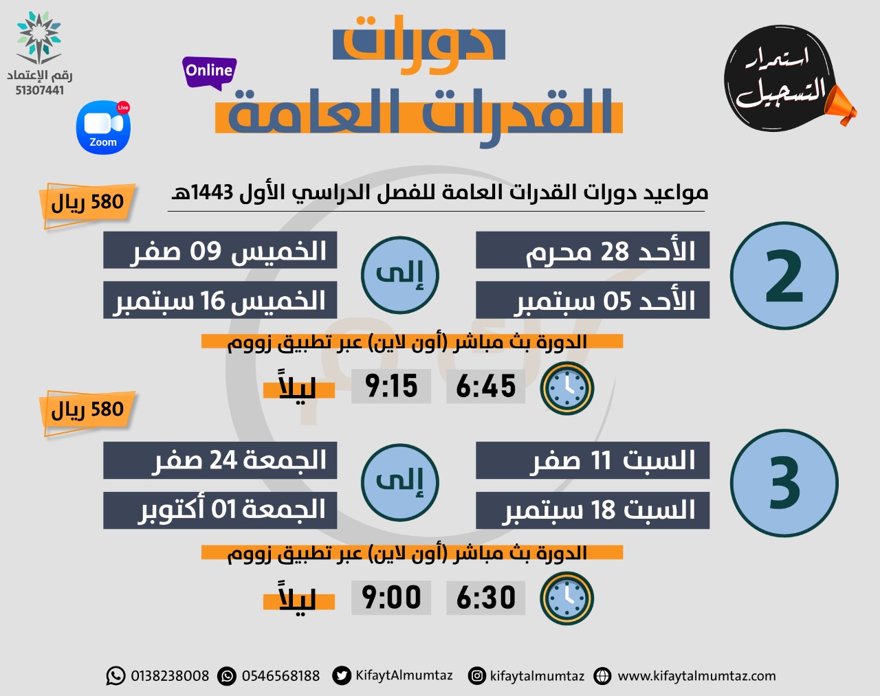 يعلن عن بدأ التسجيل في دورات القدرات العامة للنصف الدراسي الأول لعام 1443 للصف الثاني والثالث ثانوي.