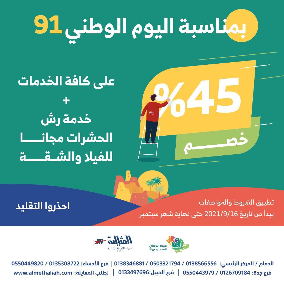 خصم 45% بمناسبة اليوم الوطني 91 على كافة الخدمات + « خدمة رش الحشرات مجانا للفيلا أو الشقة »