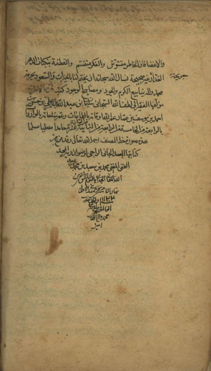 آخره: «كتب هذه الأحرف مؤلفها الفقير إلى لطف الله السبحاني سليمان بن عبد الله بن علي بن حسن بن أحمد بن يوسف بن عمّار، عمّر الله أوقاته بالطاعات، وعمّر ساحاته بالواردات بالرابعة من الخامسة من الرابعة من الثانية من الثانية حامداً مصلياً مسلماً».