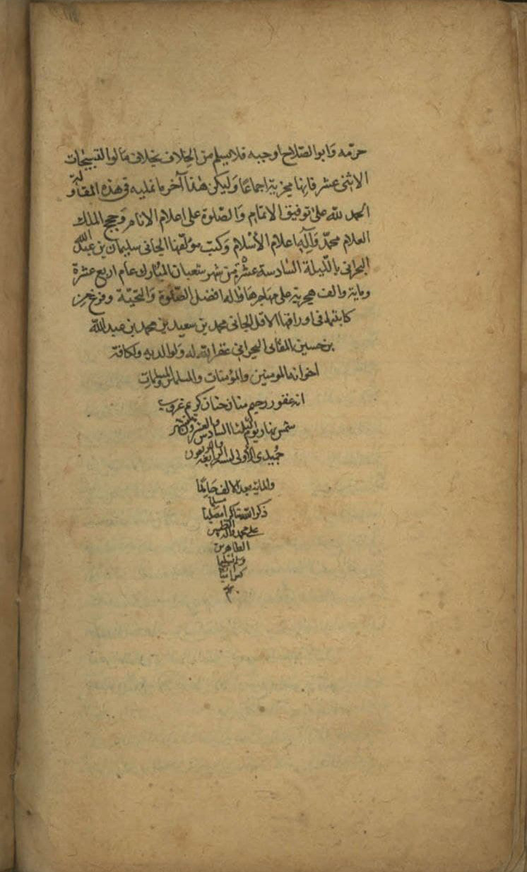 كتب آخرها: «تمت على يد كاتبها الأقل الأذل الأحقر الأصغر الراجي لغفران بل رضوان لمالكه الغني المغني المجيد محمد بن سعيد بن محمد بن عبد الله المقابي البحراني تجاوز الله عن سيئاته وسيئات والديه وسيئات أخوانه المؤمنين المؤمنات إنه غفورٌ عفوّ رحيم حنان منان كريم بضحى يوم السبت الثاني عشر شهر جمادى الثانية أحد شهور السنة الثالثة والأربعين بعد المائة والألف هجرية نبوية على مهاجرها أفضل ألف صلاة وأكرم بل أشرف ألف تحية والحمد لله رب العالمين».