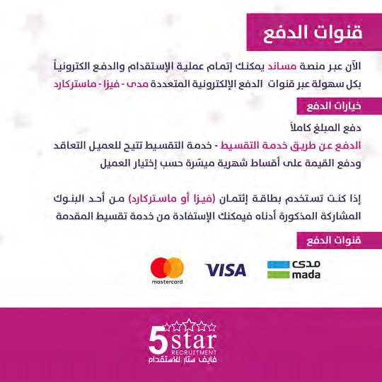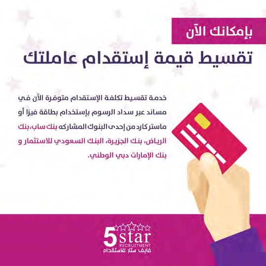 الآن بإمكانك تقسيط تكلفة استقدام عاملتك من ”فايف ستار“ والدفع الإلكتروني عبر منصة مساند.