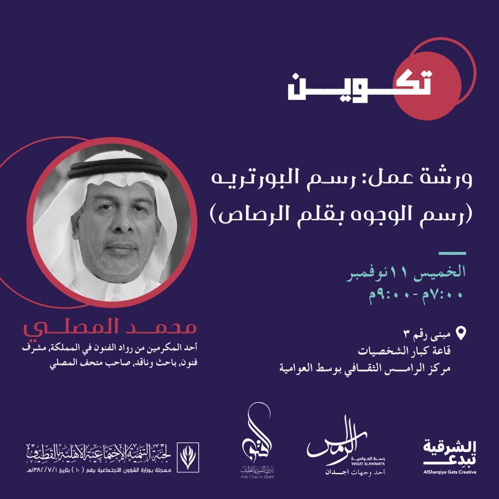 وتبدأ ورش العمل الي تقام في قاعة كبار الشخصيات - مبنى رقم 3- عند الساعة 7 مساء الخميس 11نوفمبر2021 بورشة رسم البورتريه بعنوان «رسم الوجوه بقلم الرصاص» ويقدمها الفنان محمد المصلي احد رواد الفنون بالمملكة.