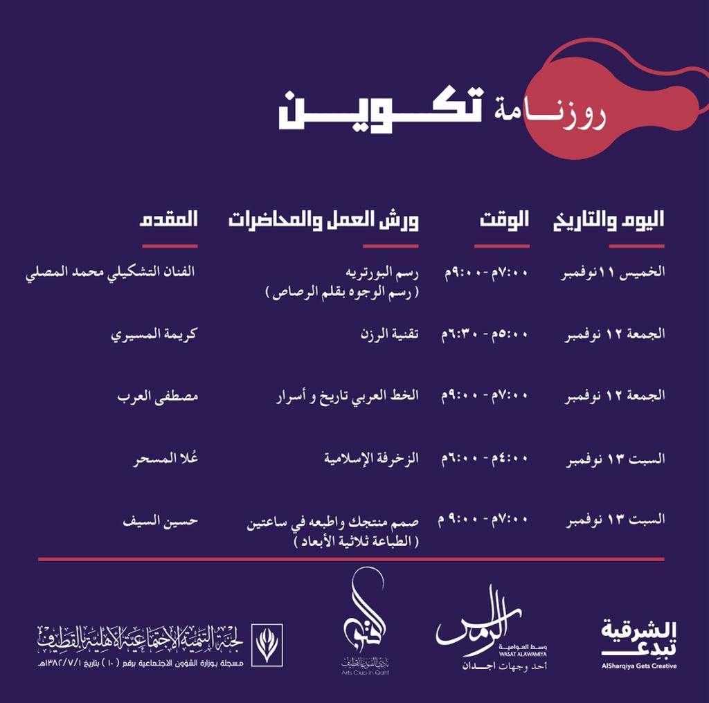 فيما يشهد يوم الجمعة 12 نوفمبر 2021 في تمام الساعة ال5 مساء ورشة عمل تقنية الرزن وتقدمها الفنانة كريمة المسيري، وتليها في الساعة ال7 محاضرة بعنوان «الخط العربي - تاريخ واسرار» يقدمها الفنان مصطفى العرب، ويشهد يوم السبت عند الساعة 4 عصرا ورشة عمل «الزخارف الإسلامية» وتقدمها الفنانة علا المسحر، تليها عند الساعة السابعة اعمال ورشة «صمم منتجتك واطبعه في ساعتين - الطباعة ثلاثية الابعاد» التي الفنان حسين السيف.