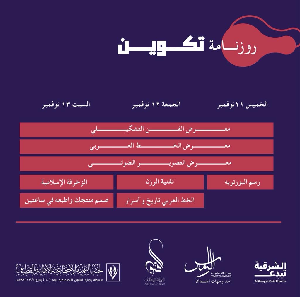 وتستضيف نخبة من الفنانين والمبدعين في الخط العربي والفن التشكيلي والتصوير الضوئي، ويصاحبها معرض للوحات والمجسمات الفنية، والعديد من ورش العمل، وعرض أعمال فنية امام محبي هذه الفنون الراقية في الهواء مباشرة، ومن المقرر ان تستمر الفعاليات الفنية والثقافية لـ 3 أيام.