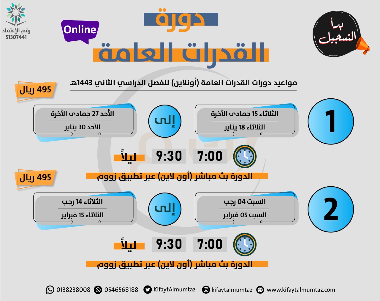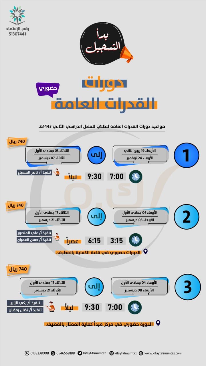 مركز "مبدأ كفاية الممتاز للتدريب" يعلن عن بدء التسجيل في دورات القدرات العامة للفصل الدراسي الثاني.