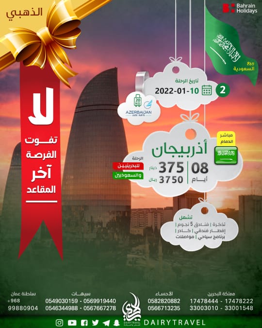 لا تفوت الفرصة .. آخر المقاعد لـ " أوكوانيا - أذربيجان " مع الديري للسفر والسياحة