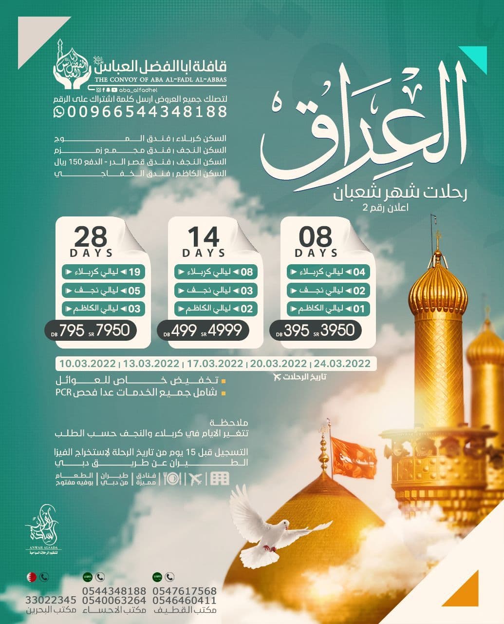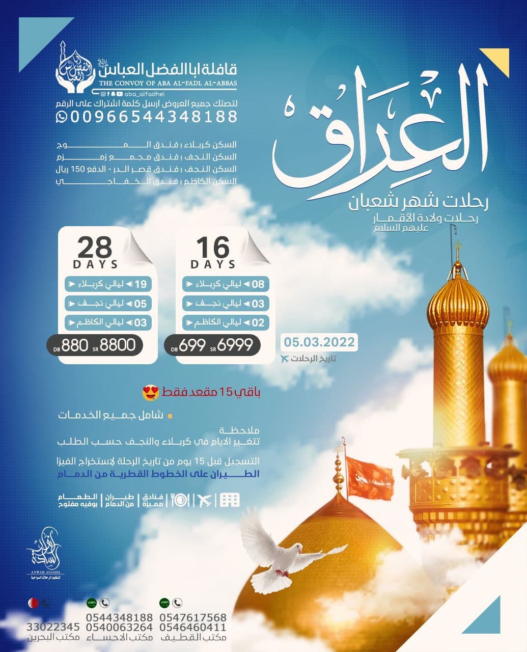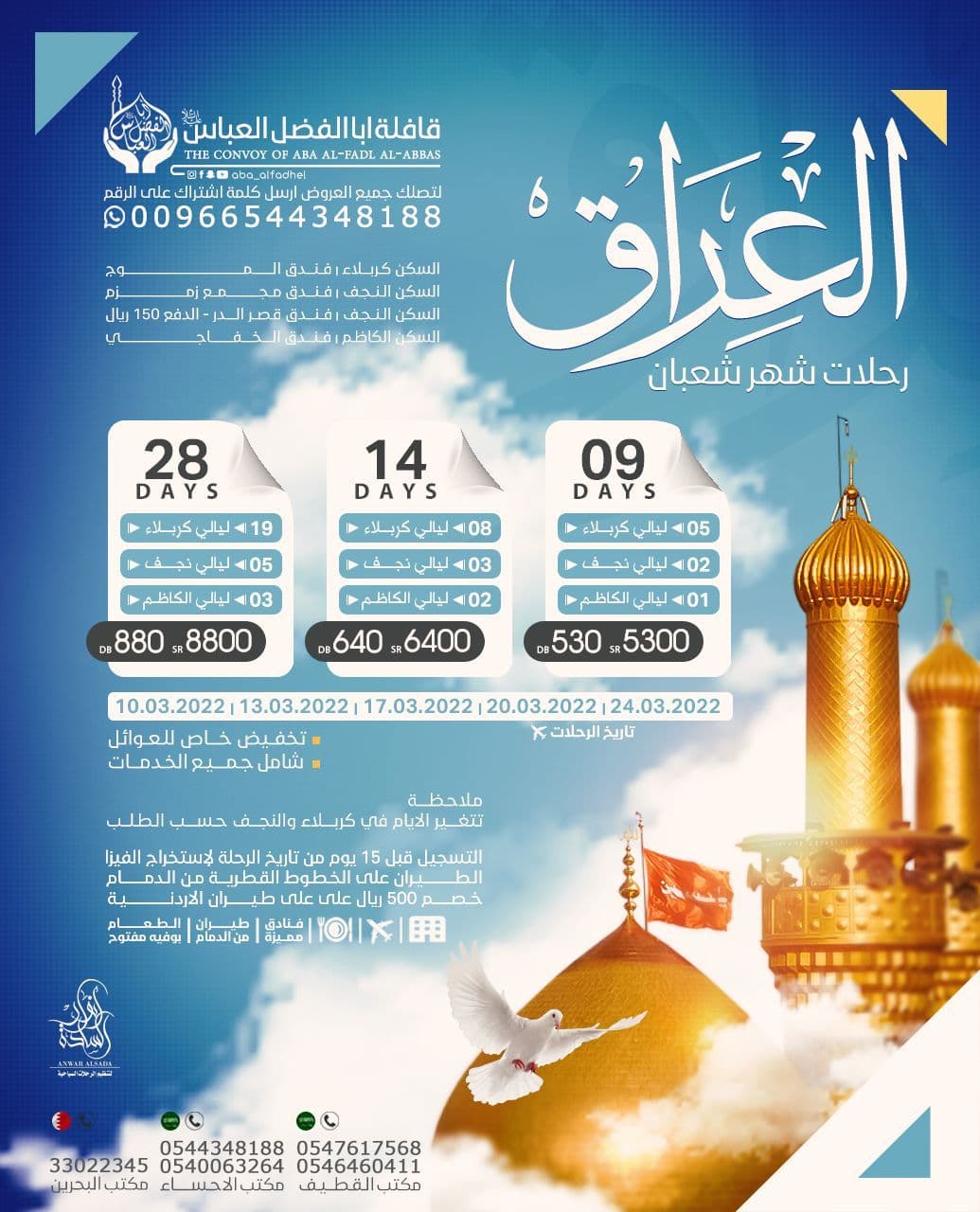 تعلن قافلة أبا الفضل العباس ومكتب أنوار السادة للسفر والسياحة عن رحلاتها لشهر شعبان