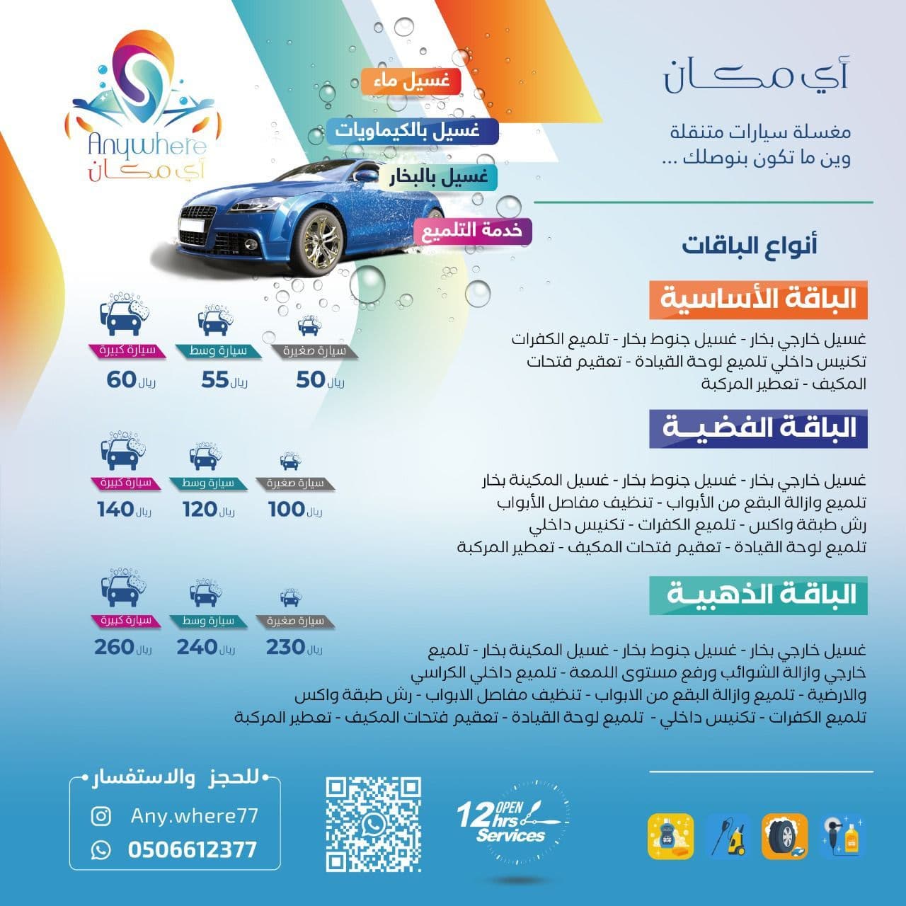 غسيل خارجي بخار، غسيل جنوط بخار، غسيل المكينة بخار، وتلميع وازالة البقع من الأبواب، تنظيف مفاصل الأبواب، رش طبقة واكس، تلميع الكفرات، تكنيس داخلي، تلميع لوحة القيادة، تعقيم