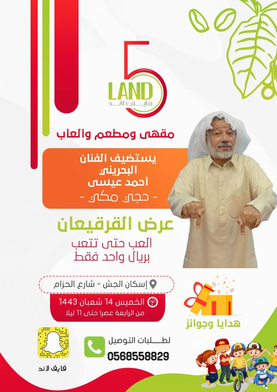 يستضيف مقهى ومطعم وألعاب 5 لاند الفنان البحريني أحمد عيسى «حجي مكي»