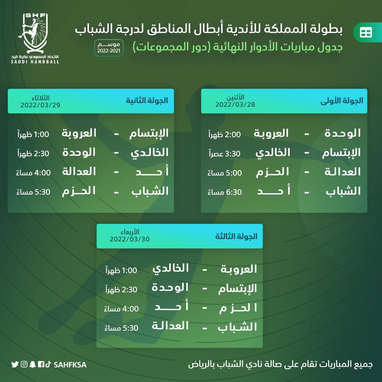 وفي المجموعة الثانية، يتواجه العدالة مع النجوم عند الساعة 5:00 مساءً، وستختتم مباريات اليوم الأول من البطولة بمواجهة الشباب مع أحد عند الساعة 6:30 مساءً.