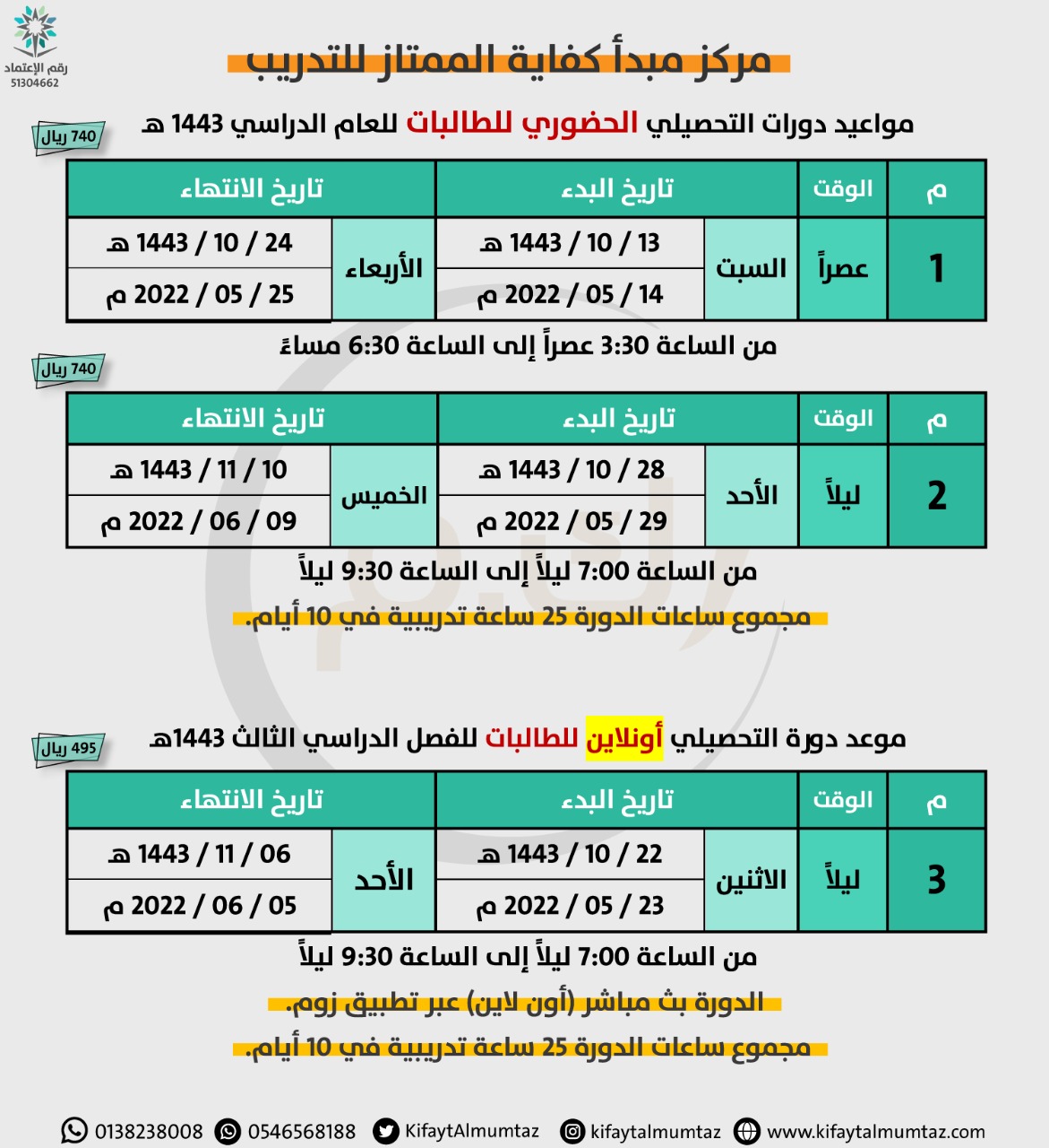 مركز مبدأ كفاية الممتاز للتدريب بإشراف الأستاذ ناصر المسباع يعلن عن استمرار التسجيل لـ ”أقوى دورات الموسم“ للفصل الدراسي الثالث