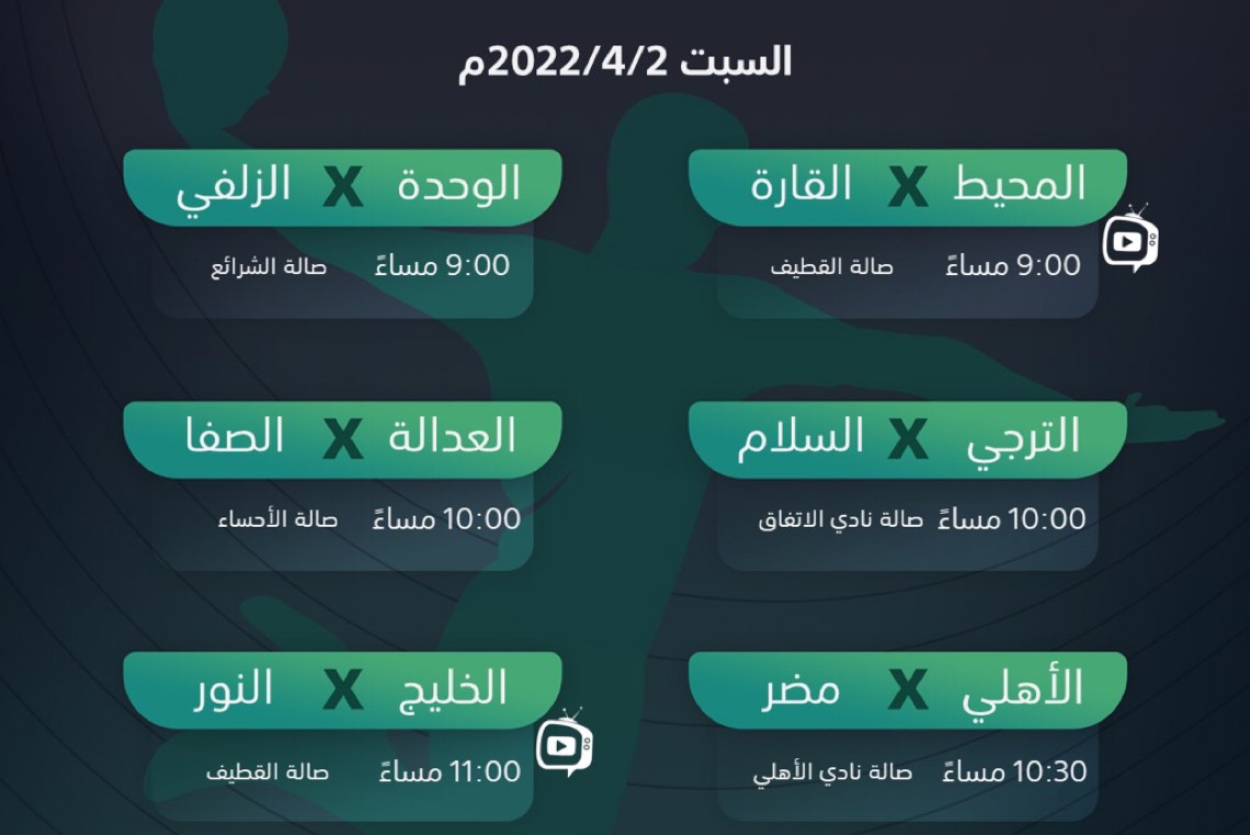 أما على صالة النادي الأهلي في جدة، سيحل فيها متصدر الترتيب ”مضر“ ضيفاً على صاحب المركز العاشر الأهلي في تمام الساعة 10:30 مساءً، فيما يواجه العدالة نظيره الصفا عند الساعة 10:00 مساءً على صالة مدينة الأمير عبد الله بن جلوي الرياضية بالأحساء، وستقام بذات التوقيت مباراة الترجي مع السلام على صالة نادي الاتفاق بالدمام، ويحل الزلفي ضيفاً على الوحدة في صالة مدينة الملك عبد العزيز الرياضية بمكة المكرمة عند الساعة 9:00 مساءً.