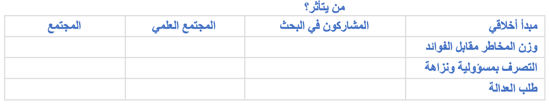 «تم تعديل هذه المبادئ من تلك الموجودة في مدونة الأخلاق للجمعية الأمريكية لعلم النفس [APA].» تمثل أعمدة الجدول 1 ”إطار للتفكير في القضايا الأخلاقية في البحث العلمي“ ثلاث مجموعات من الأشخاص المتأثرين بالبحث العلمي: البحث المشاركين والمجتمع العلمي والمجتمع بشكل عام والفكرة هي أن النظر الشامل لأخلاقيات أي مشروع بحثي يجب أن يأخذ في الحسبان كيفية تطبيق كل من المبادئ الأخلاقية الأربعة على كل مجموعة من المجموعات الثلاث من الناس.