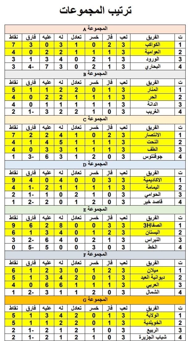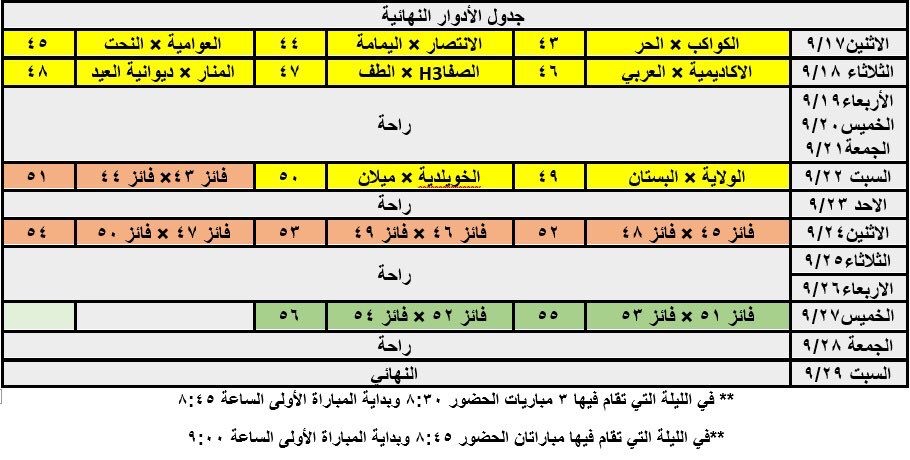 الجدير بالذكر أن الفرق التي تأهلت إلى دور ال 16 هي «الكواكب والحر والإنتصار واليمامة والعوامية والنحت والأكاديمية والعربي والصفا والطف والمنار وديوانية العيد والولاية والبستان والخويلدية وميلان»
