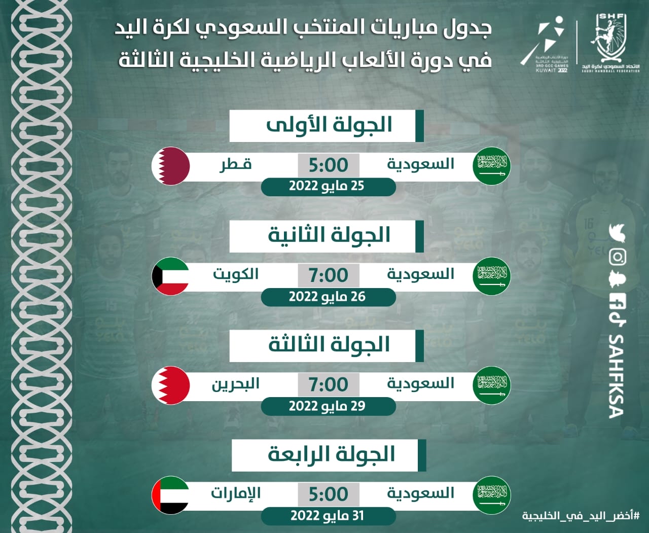 قررت لجنة المنتخبات والتدريب بالاتحاد السعودي لكرة اليد، إقامة معسكر داخلي للمنتخب السعودي الأول خلال الفترة من 15 حتى 22 مايو القادم، فيما ستغادر بعثة الأخضر يوم 23 مايو إلى دولة الكويت استعداداً للمشاركة في دورة الألعاب الخليجية الثالثة والمقرر اقامتها في الكويت خلال الفترة من 24-30 مايو 2022م.