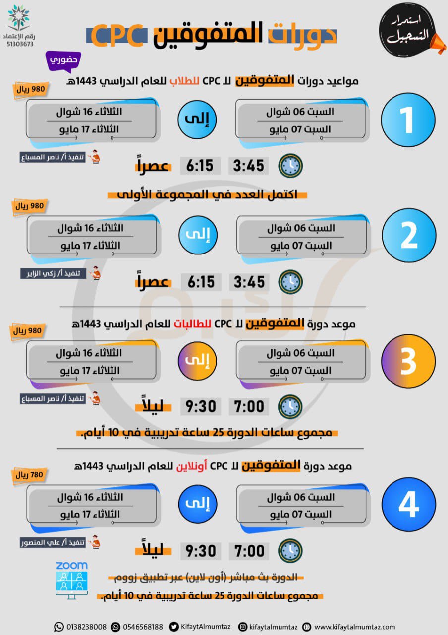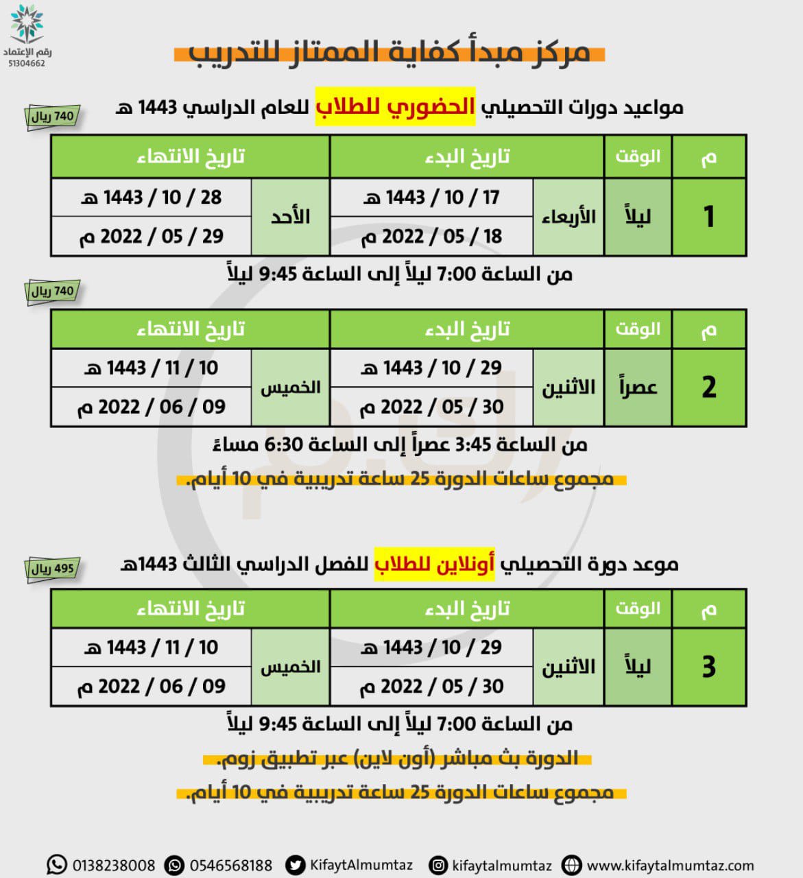 مركز مبدأ كفاية الممتاز للتدريب بإشراف الأستاذ/ ناصر المسباع يعلن عن استمرار التسجيل أقوى دورات الموسم للفصل الدراسي الثالث: