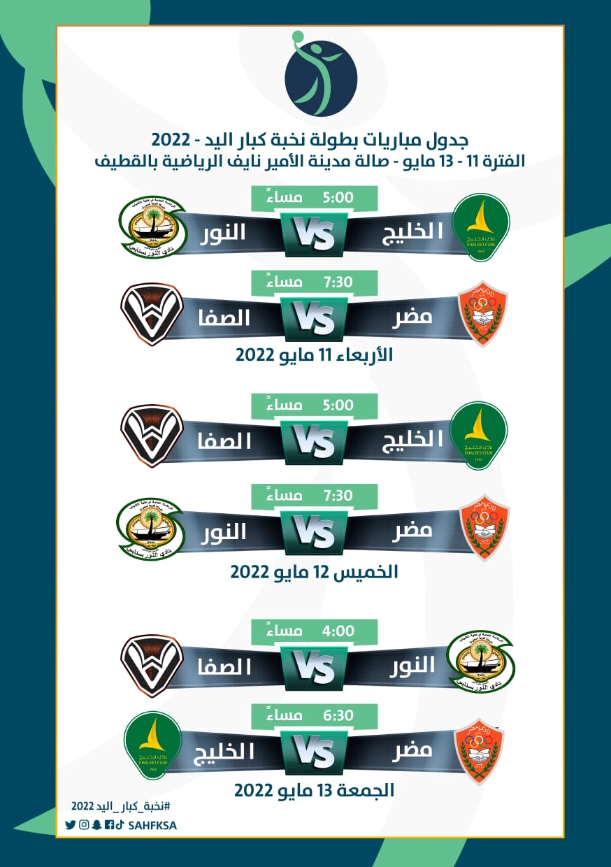 تنطلق اليوم الأربعاء، منافسات «النسخة العشرون» من بطولة النخبة لكرة اليد 2022م تحت مسمى ”نخبة كبار اليد“، بمشاركة الأندية الحاصلة على المراكز الأربعة الأولى في بطولة الأمير فيصل بن فهد لأندية الدوري الممتاز لكرة اليد للموسم الرياضي الحالي 2021- 2022م وهي: «مضر - الخليج - النور - الصفا».
