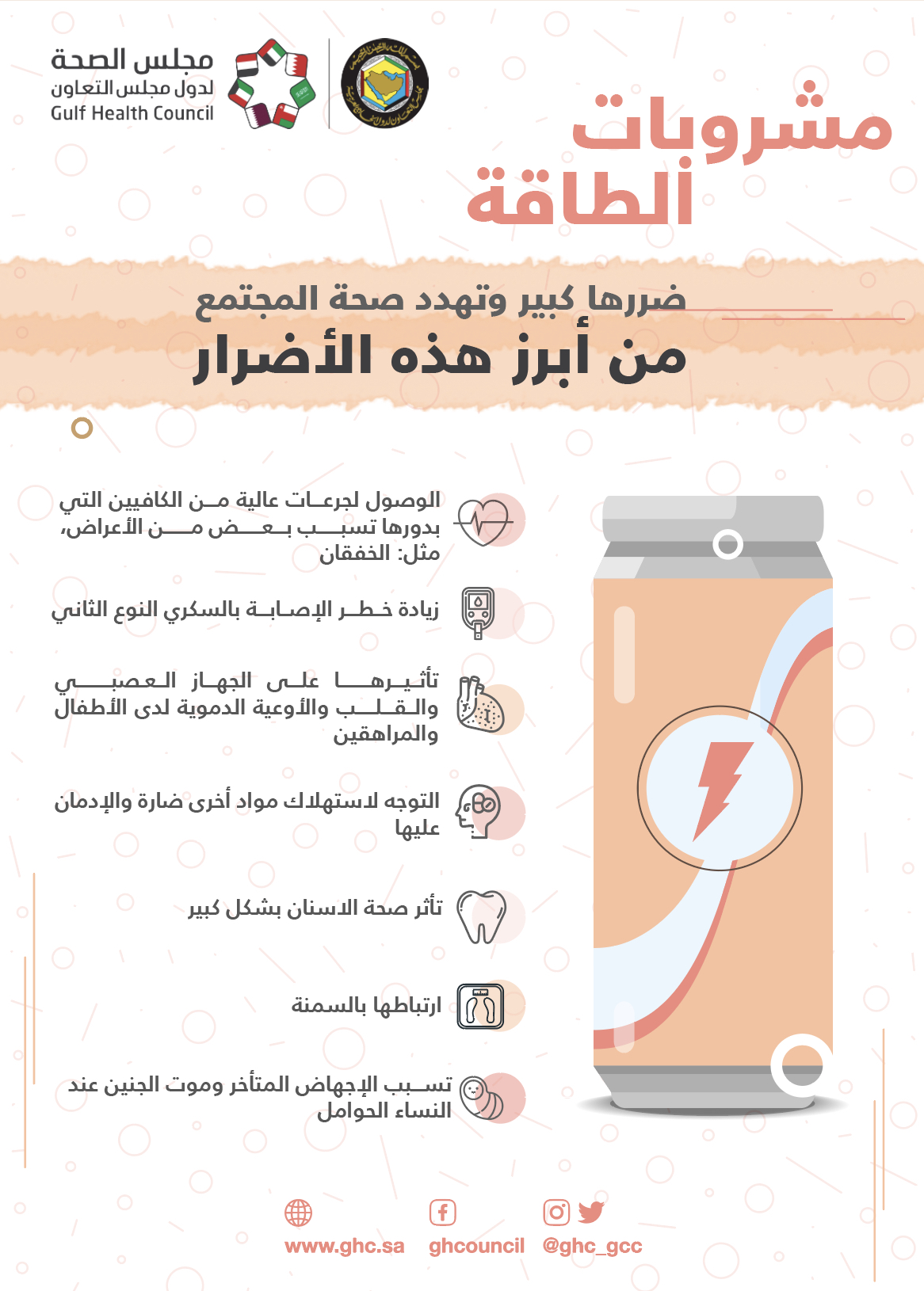 كشف مجلس الصحة الخليجي اليوم الخميس عبر حساباته الرسمية في وسائل التواصل الاجتماعية، حقيقة تناول مشروبات الطاقة بمختلف أنواعها حيث ان ضررها كبير وتهدد صحة المجتمع، وقال أن من أبرز هذه الأضرار: