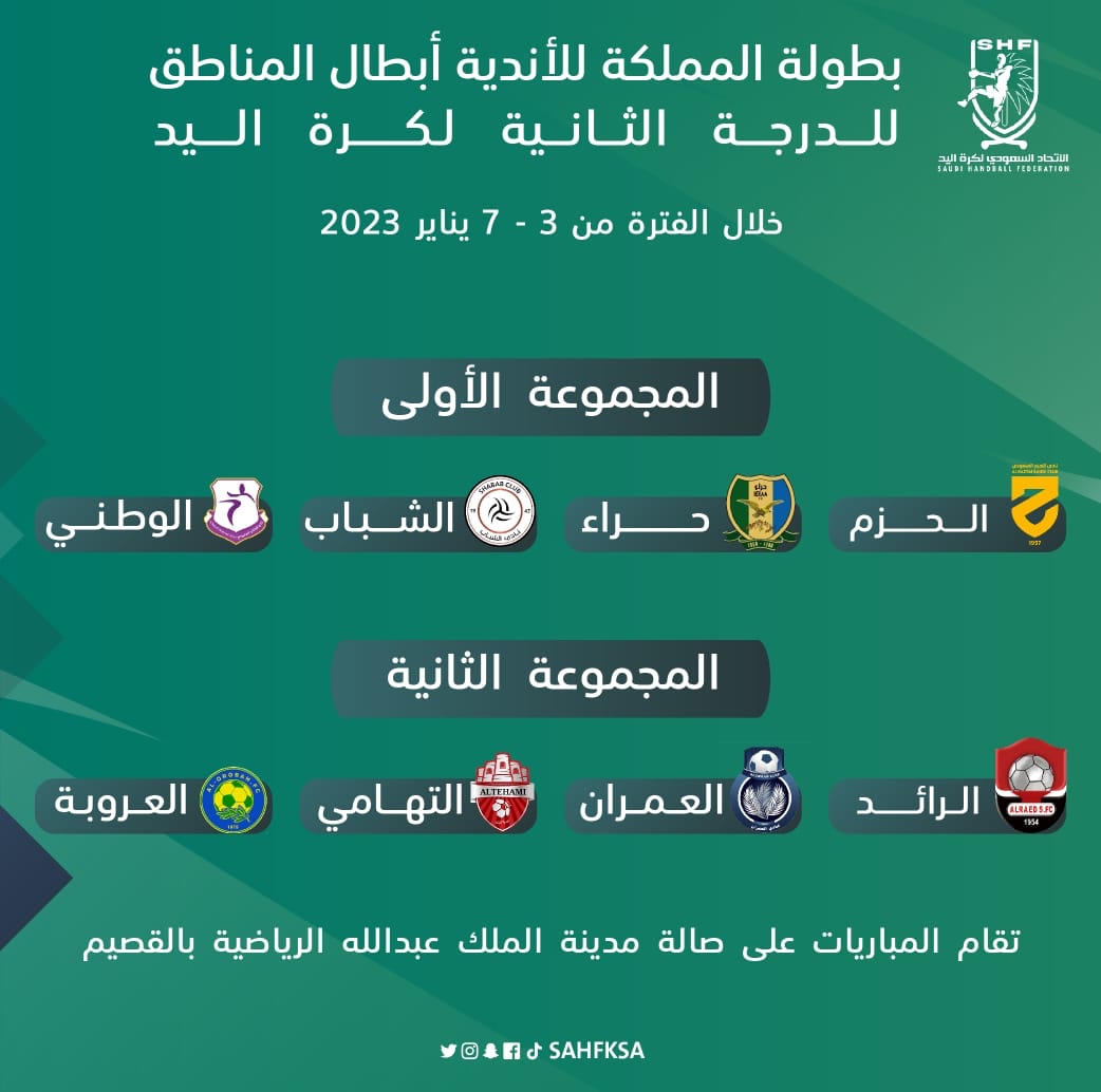 تنطلق يوم غدٍ الثلاثاء، منافسات الأدوار النهائية من بطولة المملكة لكرة اليد للأندية أبطال المناطق للدرجة الثانية للموسم الرياضي 2022-2023م، والمؤهلة للعب في بطولة دوري أندية الدرجة الأولى.