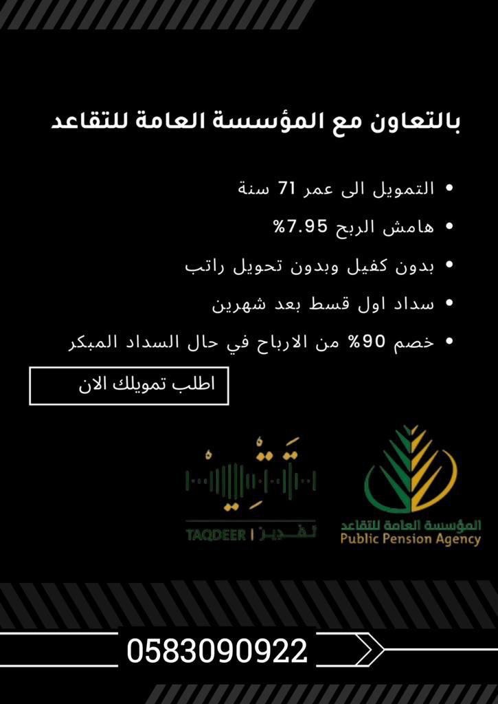 فرصة.. تمويل شخصي للمتقاعدين بدون كفيل ولا تحويل راتب
