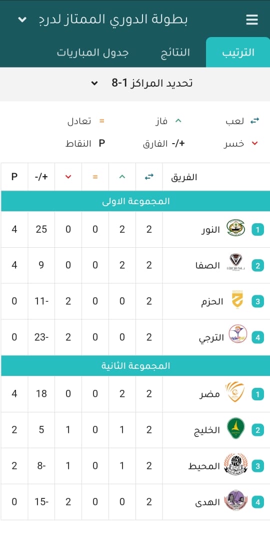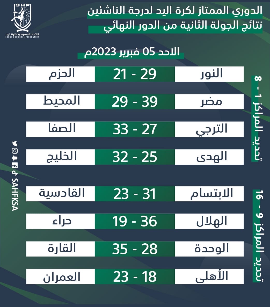 وتصدر النور المجموعة الأولى لمرحلة تحديد المراكز «1-8» بالعلامة الكاملة «4 نقاط»، بعد تغلبه على الحزم بنتيجة «29-21»، وبفارق الأهداف عن الصفا الذي يمتلك نفس الرصيد بعد تحقيقه الفوز على الترجي «27-33».