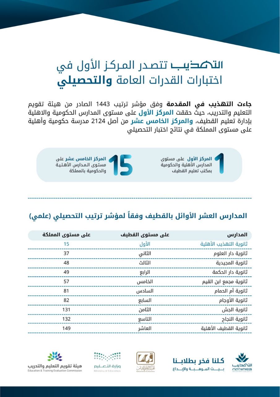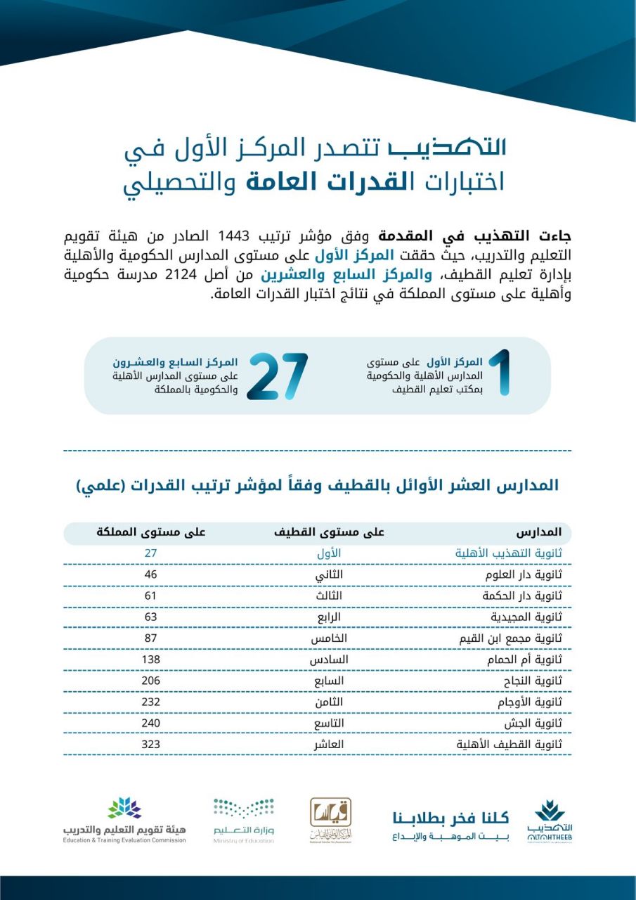 وتقدمت التهذيب على أقرب مدارس المنطقة في قائمة الترتيب ب 22 مركزًا في اختبار التحصيلي و19 مركزًا في اختبار القدرات العامة.