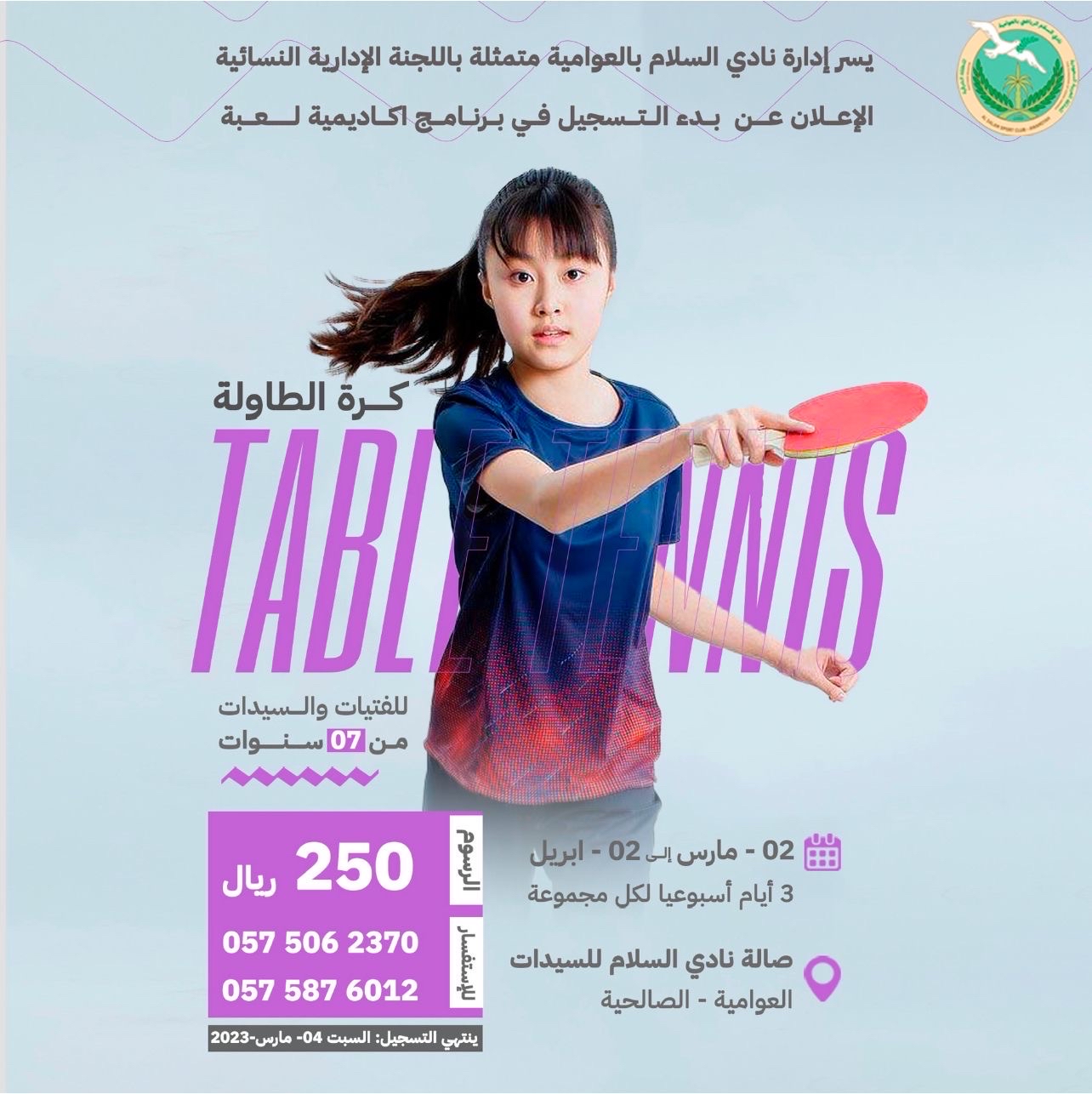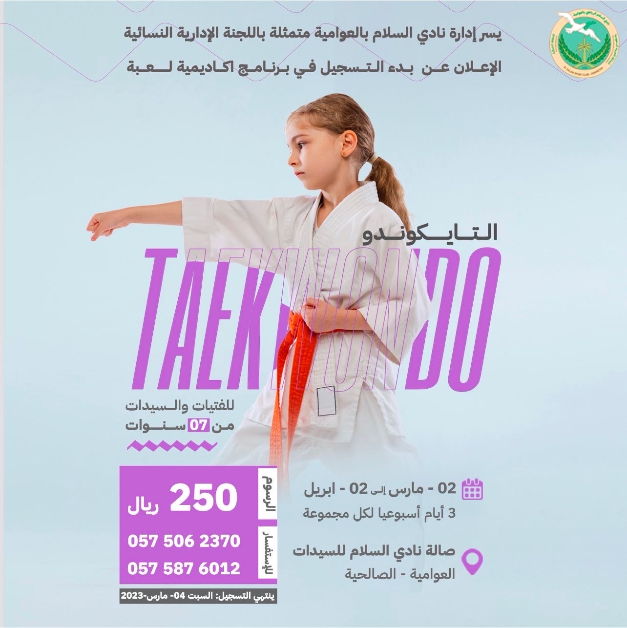 أعلنت اللجنة الإدارية النسائية بإدارة نادي السلام بالعوامية، بدء التسجيل في برنامج أكاديمية كرة الطاولة والتايكوندو للفتيات والسيدات لشهر مارس 2023.