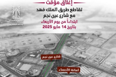 الأحساء.. إغلاق تجريبي لتقاطع الملك فهد وعين نجم الأربعاء القادم
