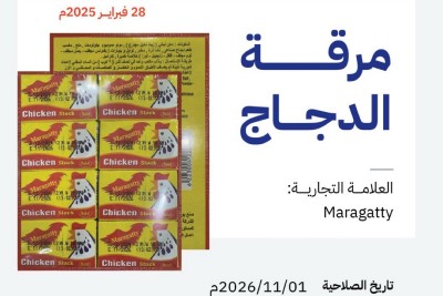 حذرت الهيئة العامة للغذاء والدواء المستهلكين من منتج مرقة الدجاج الذي يحمل العلامة التجارية ”Maragatty“، وطالبتهم بالتخلص الفوري مما لديهم من هذا المنتج، حفاظًا على صحتهم. وأكدت الهيئة أنها بادرت بسحب المنتج من الأسواق، كإجراء احترازي، نظرًا لمخالفته للوائح. يأتي هذا التحذير بعد أن كشفت التحاليل - التي لم يُفصح عن طبيعتها بالتحديد في البيان - مخالفة المنتج المذكور، والذي يُعبأ في عبوات تزن 480 جرامًا، ويتم استيراده من جمهورية مصر... |