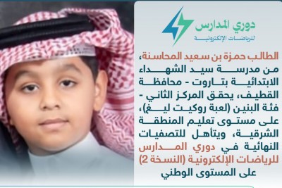 حقق الطالب حمزة سعيد المحاسنة، من مدرسة سيد الشهداء الابتدائية بمدينة تاروت، إنجازًا مميزًا بفوزه بالمركز الثاني على مستوى المنطقة الشرقية في دوري المدارس للرياضات الإلكترونية ”النسخة الثانية“ للعام الدراسي 1446 هـ، ليضمن بذلك تأهله للمنافسة في التصفيات النهائية على مستوى المملكة. وبرع المحاسنة في لعبة ”روكيت ليغ“ ”ROCKET LEAGUE“، وهي لعبة فيديو رياضية تجمع بين إثارة كرة القدم وسرعة السيارات، حيث يتحكم اللاعبون بسيارات مُزودة بصواريخ لدفع كرة عملاقة نحو... |