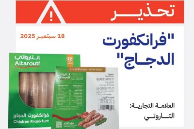 حذرت الهيئة العامة للغذاء والدواء المستهلكين بتجنب استهلاك منتج ”فرانكفورت الدجاج“ الذي يحمل العلامة التجارية ”التاروتي“، وذلك بعد أن أثبتت التحاليل المخبرية تلوثه ببكتيريا قد تشكل خطراً على الصحة العامة. وأوضحت الهيئة أن التحذير يشمل المنتج المعبأ في عبوات بحجم ”12“ قطعة، والذي يحمل رقم التشغيلة ”L2216.ZCN.F“ وتاريخ صلاحية ينتهي في الرابع من مايو 2026 م. وأكدت نتائج الفحوصات تلوث هذه التشغيلة تحديداً ببكتيريا المكورات العنقودية الذهبية ”Staphylococcus aureus“، مما استدعى إصدار... |