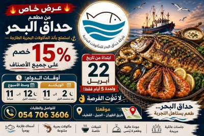 ”مطعم حدائق البحر للمأكولات البحرية“ خصم 15٪ على كامل القائمة ليوم الاثنين 27 أبريل الانستقرام: https://www.instagram.com/hadaqalbahr أوقات العمل: من الساعة 11 صباحًا إلى الساعة 2 بعد منتصف الليل المطعم مفتوح غداء وعشاء ... |