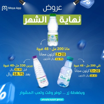 ”مويا آب“ يوفر لك جميع منتجات المياه والعلامات مثل نوفا، بيرين، نقي، مانا، صفا مكة وأكثر.