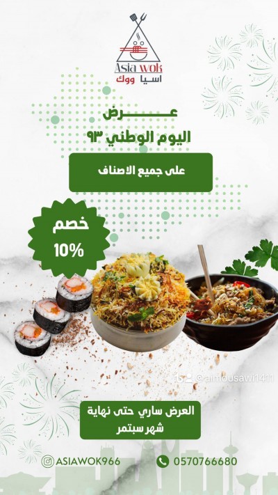 خصم 20% لدى مطعم ”اسيا ووك“ ألذ المأكولات الاسيوية أطباق لذيذة من المطبخ الصيني خصم 10% حتى نهاية الشهر 📍موقعنا: https://maps.app.goo.gl/rcPZ4mHQsFGm4SbH8 الانستقرام: ... |