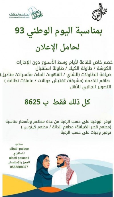 بمناسبة اليوم الوطني: القاعات الكبيرة بـ 5 الاف ريال وقاعات الجلوات والخطوبة بـ 3 الاف ريال لدى ”توليب للأفراح“ رقم الحجوزات 0566344283 0545763550 📍 موقع القاعة التي تم التصوير فيها «توليب 6» https://maps.app.goo.gl/yBeEXpXHbP3vBopu5 انستقرام قاعات توليب: ... |