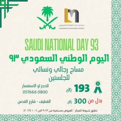 بمناسبة اليوم الوطني السعودي 💚93 💚 يقدم مركز لاندمارك للعلاج الطبيعي عرض للجنسين جلستين مساج بقيمة 193 ريال بدلاً من 300 4 جلسات + فحص مجاني بقيمة 593 ريالا بدلاً من 650 6 جلسات + فحص مجاني بقيمة 793 ريالا بدلاً من 890 ... |